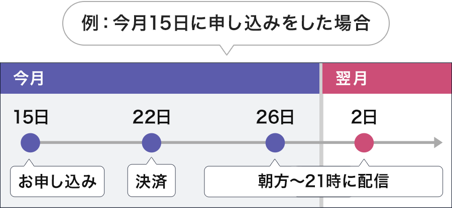 毎月26日・2日の朝方〜夜21時までの配信を予定しております。